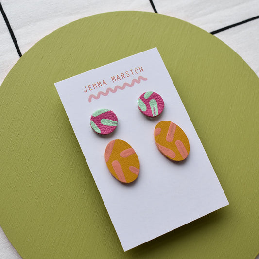 Two Set Of Leather Studs Earrings - Mini Stud And Mini Oval Stud