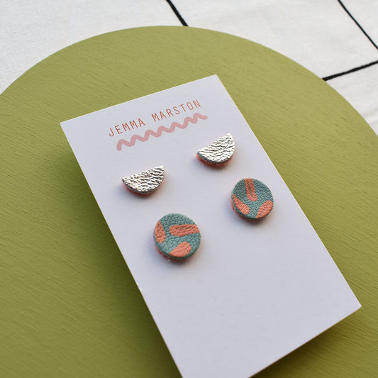 Two Set Of Leather Stud Earrings - Mini Stud And Half Moon Stud