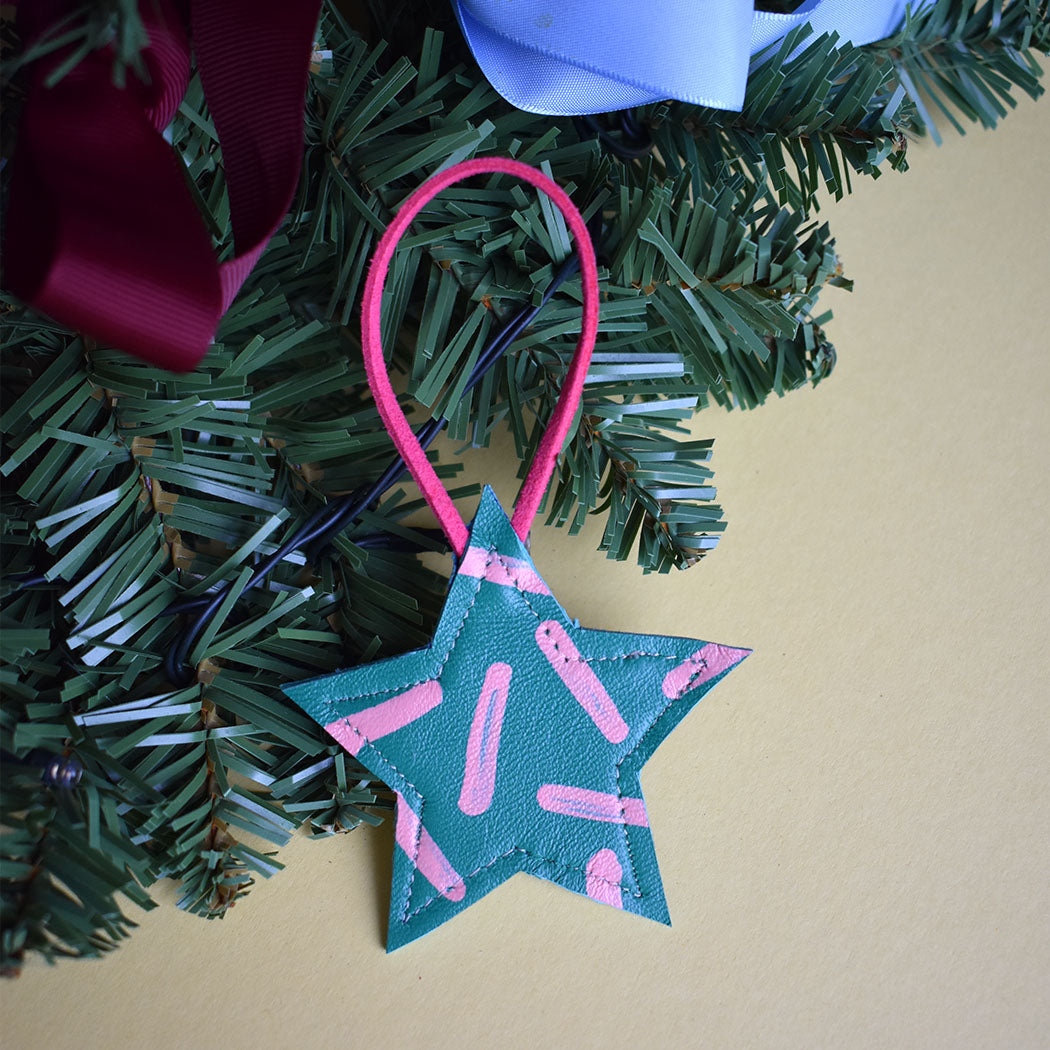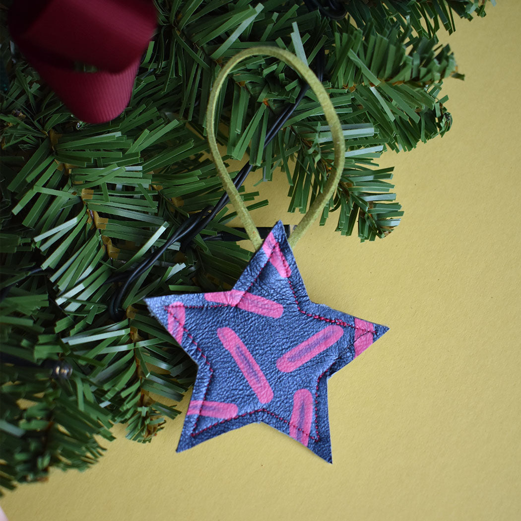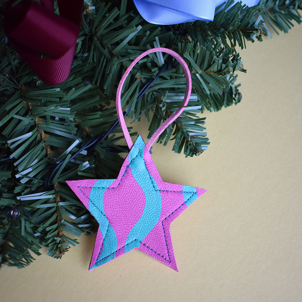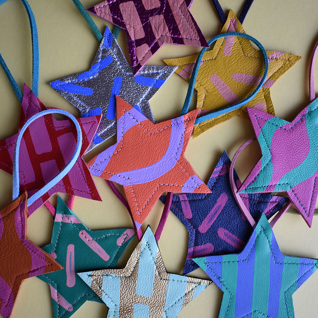 Beautiful Hand Painted Leather Mini Star Christmas Decorations. These are made in a variety of styles and colour ways that will no doubt bring a smile and a bit of colour to your home this Christmas.
